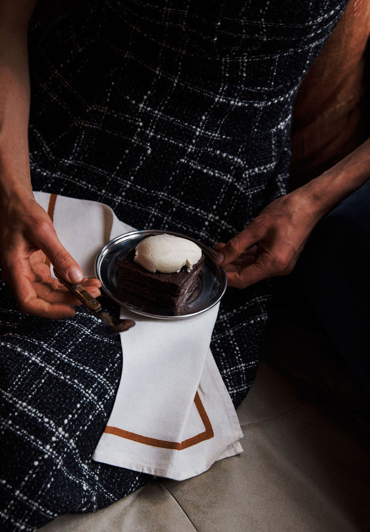 Riga Tablecloth. White linen cloth with thick rust stripes, draped on floating table. Riga tablecloth. Folded rectangular white linen cloth with thick rust stripes.