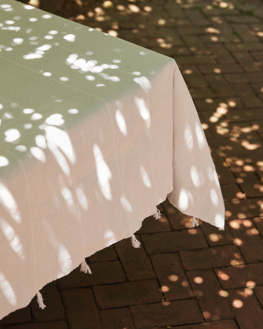 The Cordon Tablecloth, a white rectangular cotton cover with subtle vertical stripes and fringe tassels, is draped over a table against a plain white background—ideal for summer gatherings. The Cordon Tablecloth is made from soft white cotton, featuring stitched lines and delicate fringe tassels along the edge, shown folded against a plain white background.