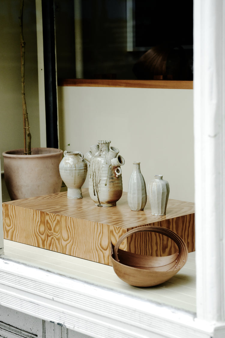 Frances Palmer held a special early spring wood firing in her purpose wood kiln. A true work of alchemy, Palmer uses clay bodies specifically designed for wood firing, selecting glazes that play well with the ash and flame. No two pots are alike and can never be repeated - a magical chemistry that can happen only in this type of firing and the glazes that result can be seen as paintings on the forms.