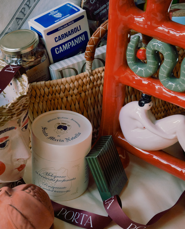 The All Out Hamper: "Another beloved English tradition, and one that makes me so nostalgic. A mighty basket filled with pantry treasures — biscotti, panettone, extra virgin olive oil— plus PORTA favourites like our soaps, coasters, and crackers. It’s a gift that feels both impressive and thoughtful, unpacked and enjoyed piece by piece."